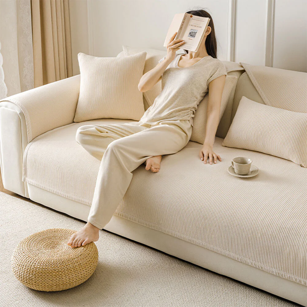 Modern Cream Vertical Stripes Fleece Couch Cover for All Seasons